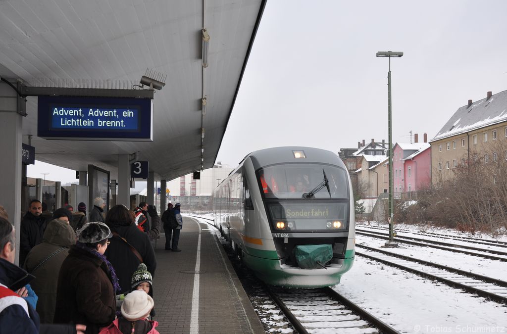 Am ersten Adventswochenende, genauer am 01. + 02. Dezember 2012 pendelte ein Triebwagen der Vogtlandbahn im Auftrag der Amberger Kaolinbahn e.V. zwischen Amberg und Schnaittenbach. Mehr…Unterwegs wurden auch die Orte Hirschau und Gebenbach bedient. Die Fahrgäste von Amberg konnten sich in Hirschau und Schnaittenbach auf den dort stattfindenden Weihnachtsmärkten die Zeit vertreiben und sich den ein oder anderen Glühwein, bzw. Punsch schmecken lassen. An diesem Wochenende war auch der Kräutergarten in Schnaittenbach für Besucher geöffnet. Bei den vorgenannten Fahrzeiten bestand genügend Zeit, um einen Bummel in der jeweiligen Nachbarstadt zu unternehmen. Vor allem hatten die Züge genügend Standzeit an den jeweiligen Endhaltepunkten eingeplant.
