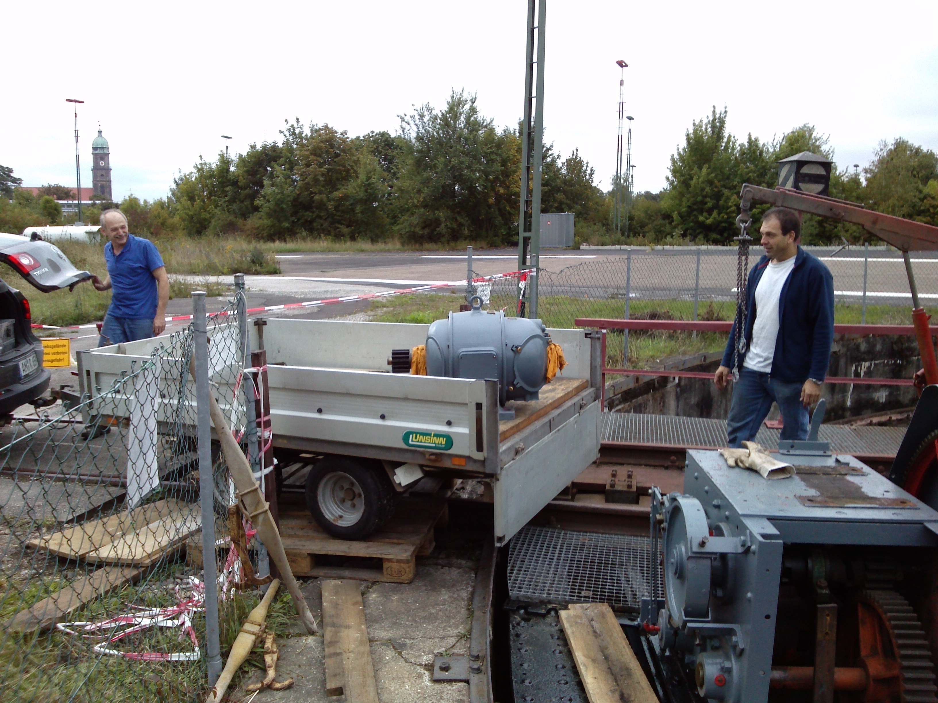 Neuigkeiten für den Drehscheiben-Antrieb: Damit sich unsere Scheibe wieder drehen kann erfolgte am 14. September der Ausbau und der Abtransport des Elektromotors der Drehscheibe. Mit einiger Müh und dem nötigen Werkzeug gelang es uns den Motor von seinen Schellen zu befreien und Ihn mit vereinten Kräften auf den Hänger zu hiefen. Er befindet sich nun bei der Firma Ritz und wird für seine künftige Aufgabe gereinigt, imprägniert und getestet. Vielen Dank an alle Beteiligten! Die Revision wird eine Woche dauern. Die Jungfernfahrt rückt näher!