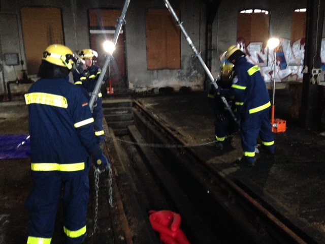 Einer der Dummys wurde in der ehem. Lokomotivuntersuchungsgrube3 platziert, hier wurde eine Mannbergung simuliert, welche mittels eines Hebe- Hilfsgestells sowie einer Trage durchgeführt wurde. Zuvor wurde eine Beleuchtungsanlage installiert inclusive Stromversorgungsaufbau mittels THW – Generator um die erschwerten Sichtbedingungen für die Bergungsmannschaft optimieren zu können.