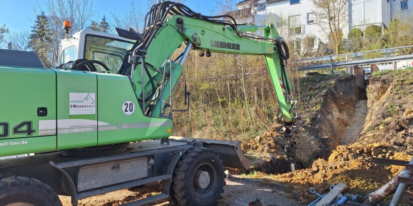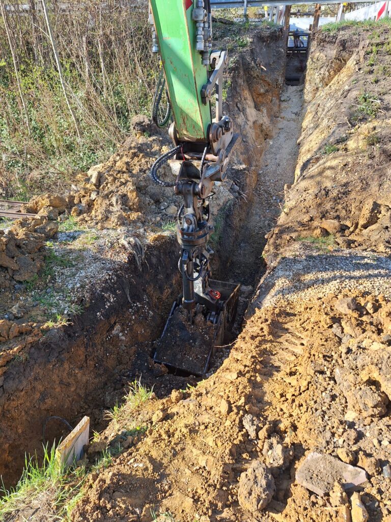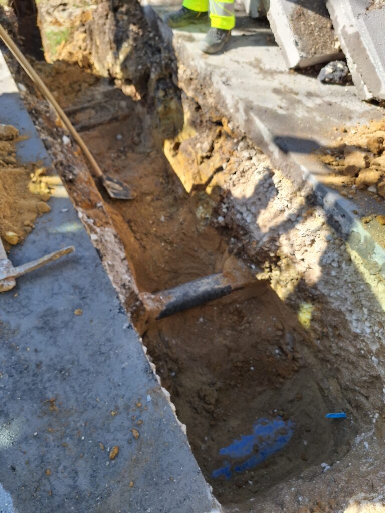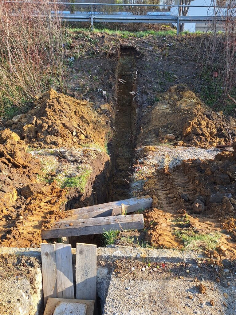 Die Bauarbeiten sind fast abgeschlossen und das Wasser kann bereits fließen. Innerhalb weniger Tage haben uns die Stadtwerke Amberg unseren neuen Wasseranschluss im Museumsanbau gesetzt. Ein wichtiger Schritt, denn ohne Wasser können wir die neue Heizung nicht einbauen. Ab sofort müssen wir auch keinen Schlauch mehr über das Gelände ziehen um weiter arbeiten zu können. Knifflig war die Verlegung der Anschlussleitung dennoch. Dadurch das die Straße rund 5 Meter oberhalb unseres Geländes verläuft, musste zunächst ein Graben den Hang hinaufgezogen werden. Anschließend konnte das Schutzrohr verlegt werden um dann das Rohr durch zu schieben.