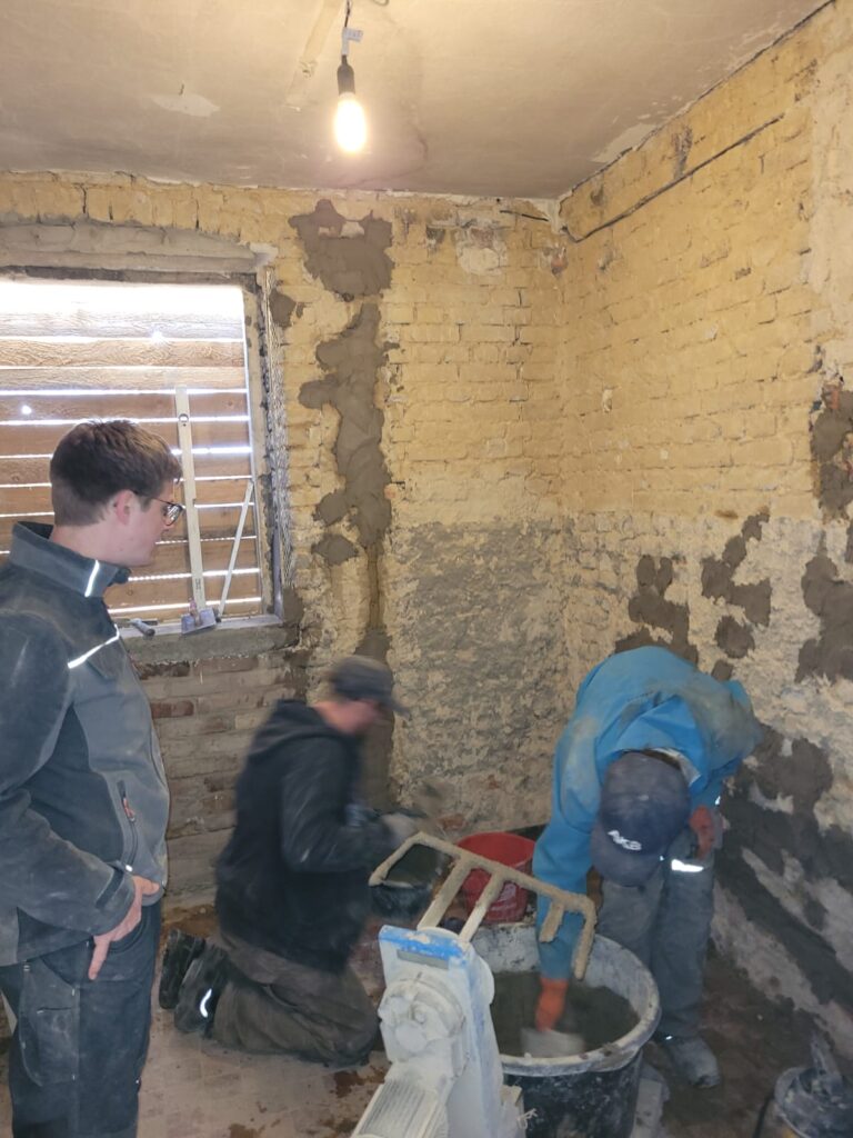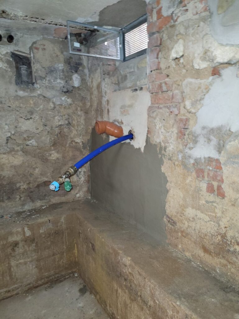 In der Zwischenzeit waren wir natürlich nicht untätig. Die Sanierung unseres Treppenhausturms geht gut voran. Das Mauerwerk ist inzwischen weitestgehend ausgebessert und der erste Putz wurde probehalber aufgezogen. auch ein Teil der Sanitärinstallation wurde schon montiert. Als nächstes werden die Laibungen für die Fenster fertig gestellt, um diese dann bestellen zu können. Im Keller haben wir auch noch einiges zu tun. Dadurch das hier viele Jahre lang das Wasser teils bis zur Decke stand, hat sich der meiste Putz gelöst. Die Wände müssen wir teilweise ausbessern und anschließend neu verputzen.